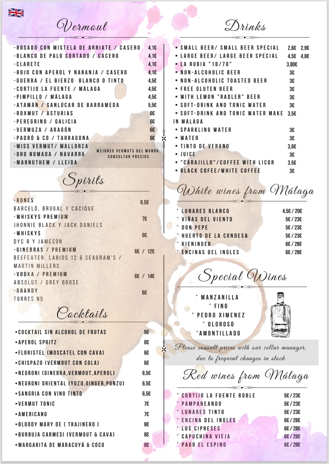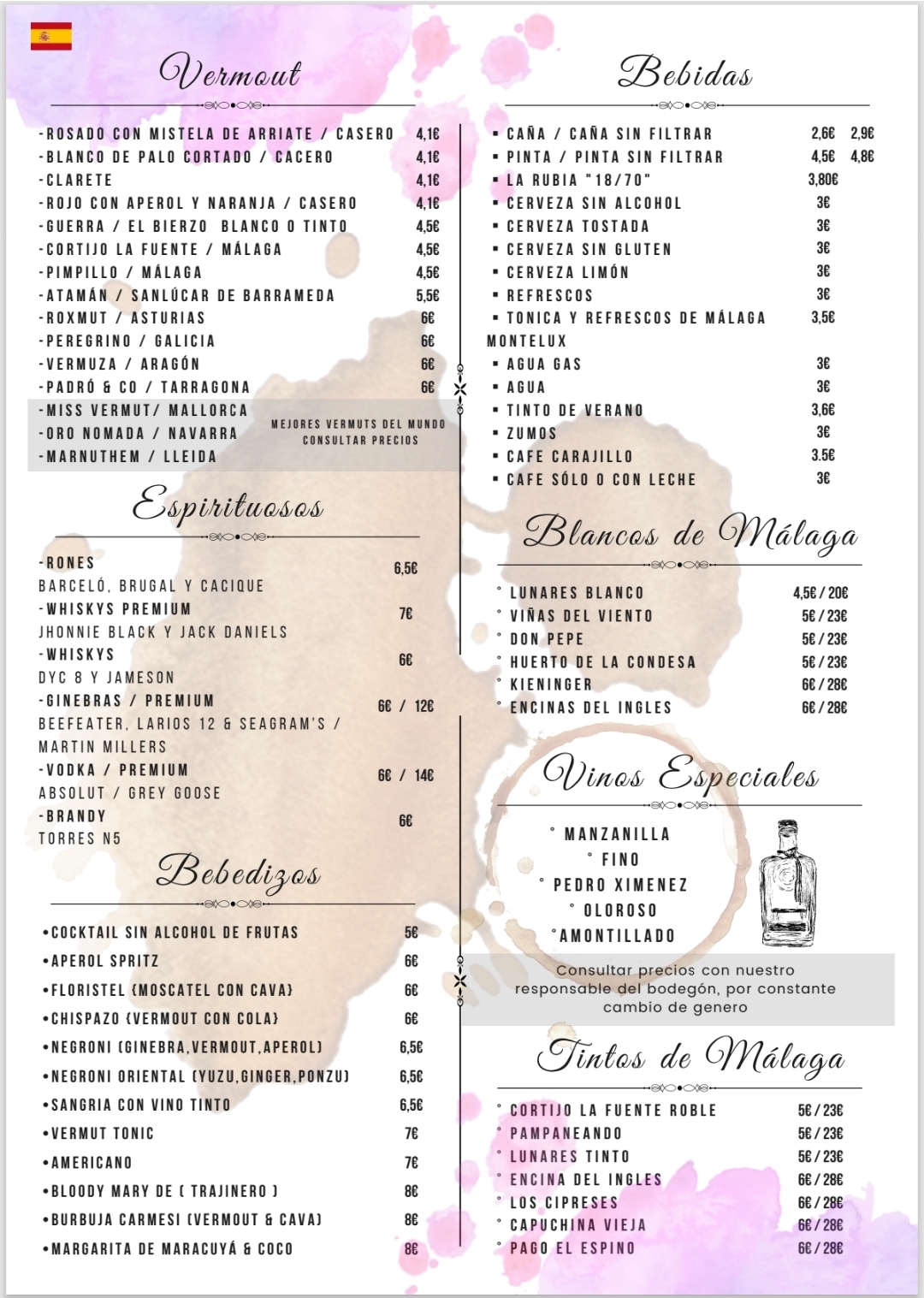 Gran variedad en vinos malagueños, y nacionales de diferentes rincones y con mucho carácter, con y sin sulfitos, diferentes y muy clásicos